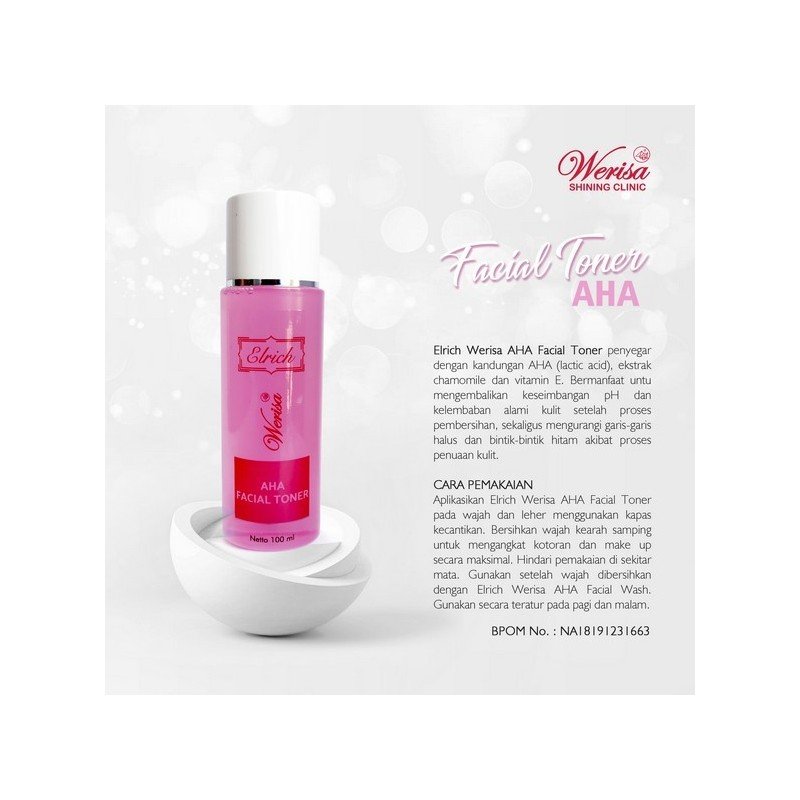 Elrich Werisa Facial Toner AHA merupakan Penyegar dengan kandungan AHA (lactic acid), ekstrak chamomile dan vitamin E. Bermanfaat untuk mengembalikan keseimbangan pH dan kelembaban alami kulit setelah proses pembersihan, sekaligus mengurangi garis-garis halus dan bintik-bintik hitam akibat proses penuaan kulit