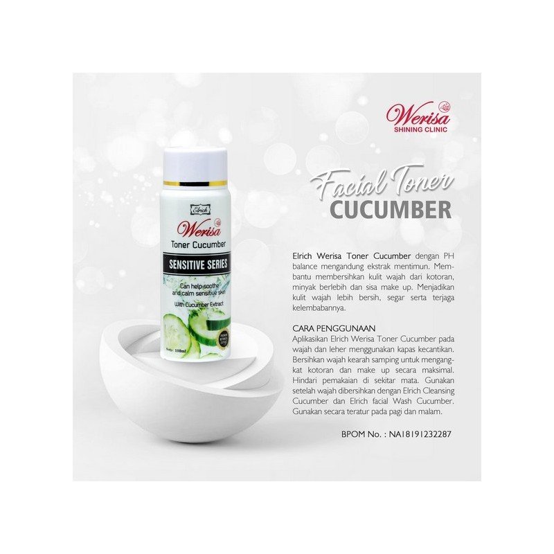 Elrich toner cucumber dengan PH balance mengandung ekstrak mentimun aman digunakan untuk kulit sensitive berfungsi membersihkan kulit wajah dari kotoran, minyak berlebih dan sisa make up. Menjadikan kulit wajah lebih bersih, segar serta terjaga kelembabannya
